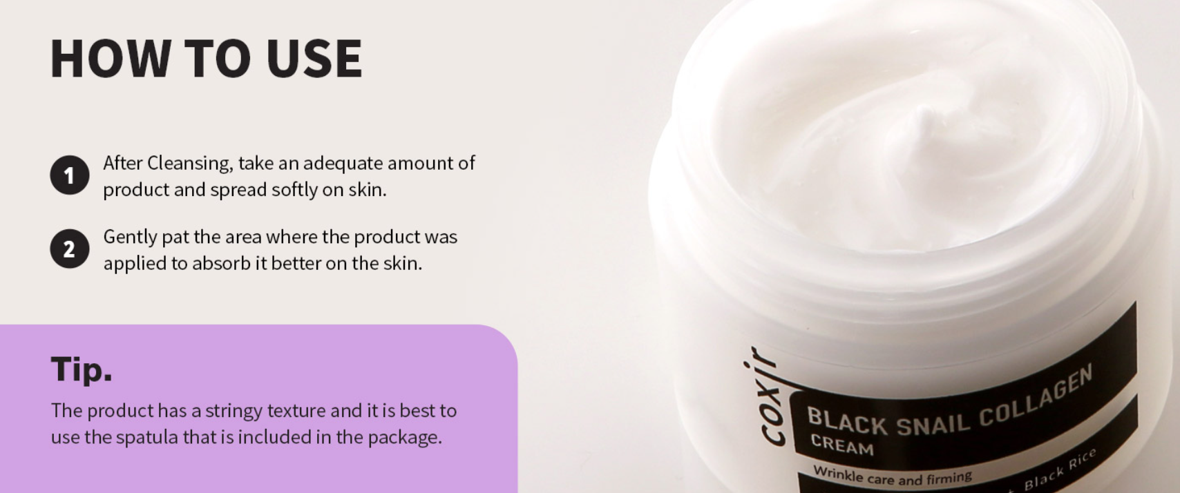The Black Snail Collagen Cream contains the ingredients of snail and collagen to protect skin from dryness by maintaining moisture levels and providing luminance to the skin.