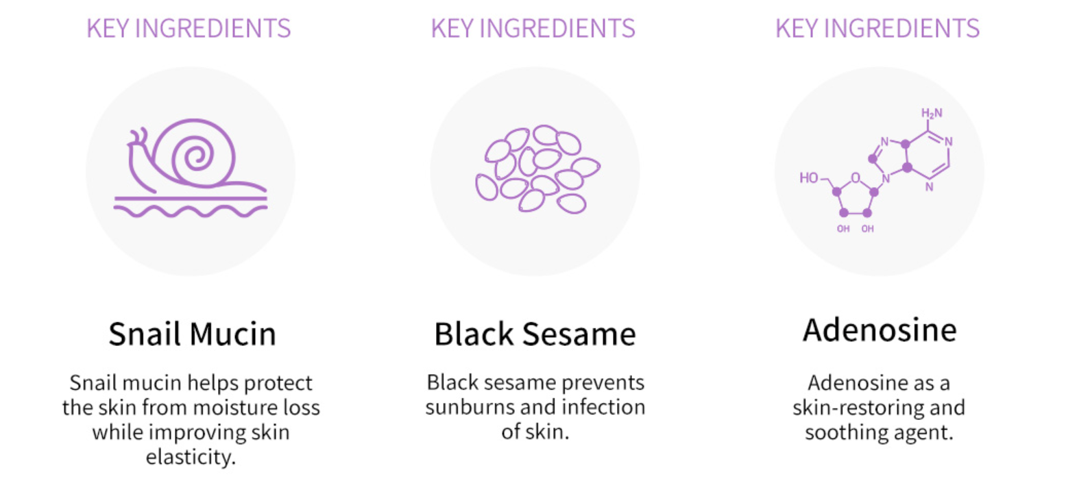 Snail Secretion Filtrate, Betula Platyphylla Japonica Juice, Butylene Glycol, Sodium Hyaluronate, Glycerin, Water(Aqua), Glycoproteins, Betaine, Glyceryl Acrylate/Acrylic Acid Copolymer, 1,2-Hexanediol, Glyceryl Stearate, PEG-100 Stearate, Aqua(Desalted Deep Seawater), Stearyl Alcohol, Cetyl Alcohol, Cetyl Ethylhexanoate, Isohexadecane, Galactomyces Ferment Filtrate, Viola Mandshurica Flower Extract, Morus Alba Fruit Extract, Glycine Max (Soybean) Seed Extract, Sesamum Indicum (Sesame) Seed Extract, Oryza Sativa (Rice) Extract, Panax Ginseng Berry Extract, Hydrolyzed Collagen, Adenosine, Copper Tripeptide-1, Polysorbate 60, Betaine, Sorbitan Stearate, Sodium Acrylate/Sodium Acryloyldimethyl Taurate Copolymer, Polysorbate 80, Stearic Acid, Arginine, Carbomer, Citrus Nobilis (Mandarin Orange) Peel Extract, Cupressus Sempervirens Leaf/Stem Extract, Hedera Helix (Ivy) Leaf/Stem Extract, Citrus Aurantium Bergamia (Bergamot) Fruit Oil, Litsea Cubeba Fruit Oil, Ribes Nigrum (Black Currant) Leaf Extract