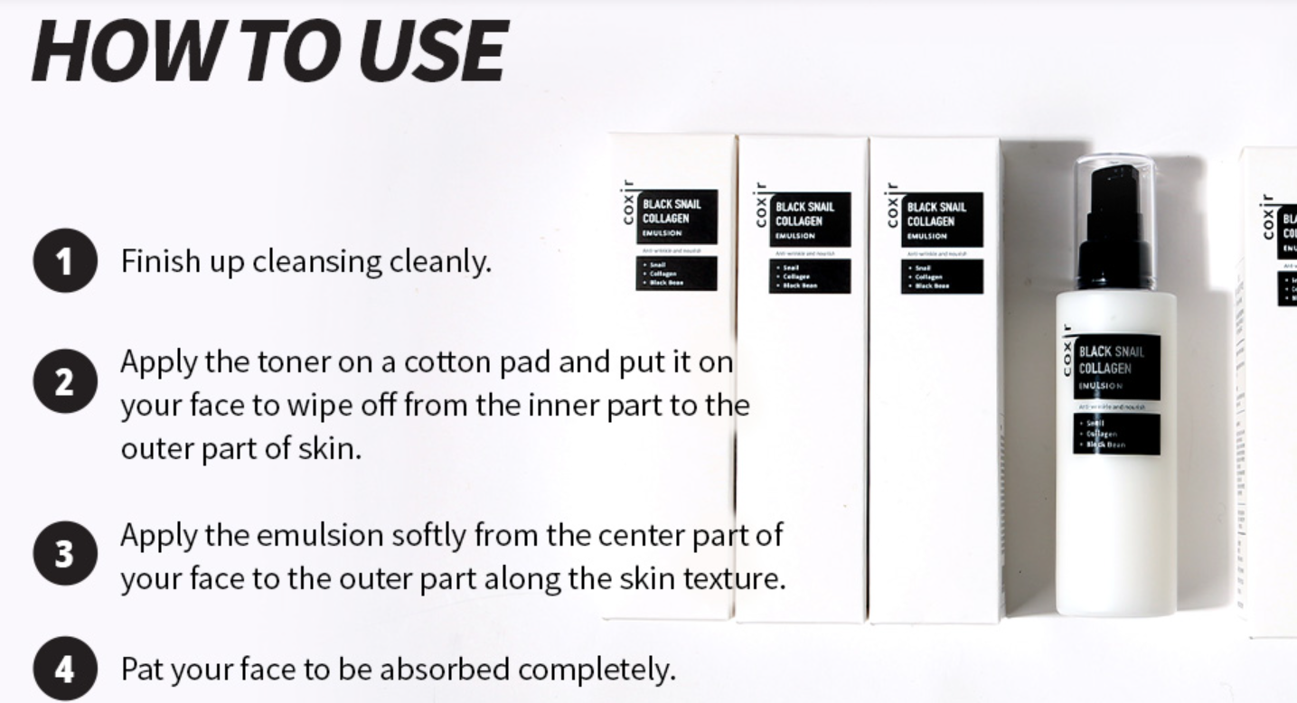 The Black Snail Collagen Emulsion contains the ingredients of snail and collagen to protect skin from dryness by maintaining moisture levels and providing luminance to the skin.