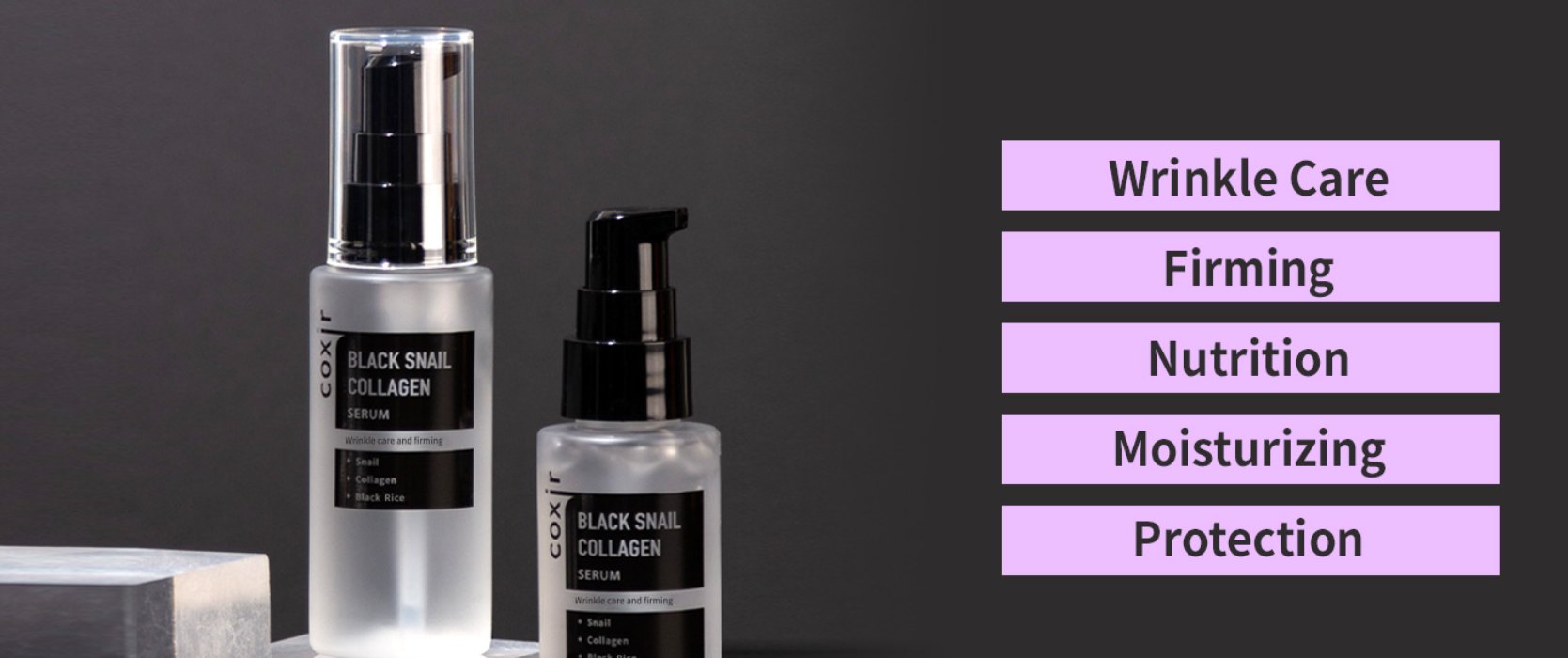 • Intensive Snail Wrinkle Serum: Snail secretion filtrate repairs and nourishes the skin from dryness, and Collagen for firming and lifting the skin from dry, aged skin. This serum helps wrinkle care, fade away fine lines, blemish and care elasticity that results in plump, dewy skin