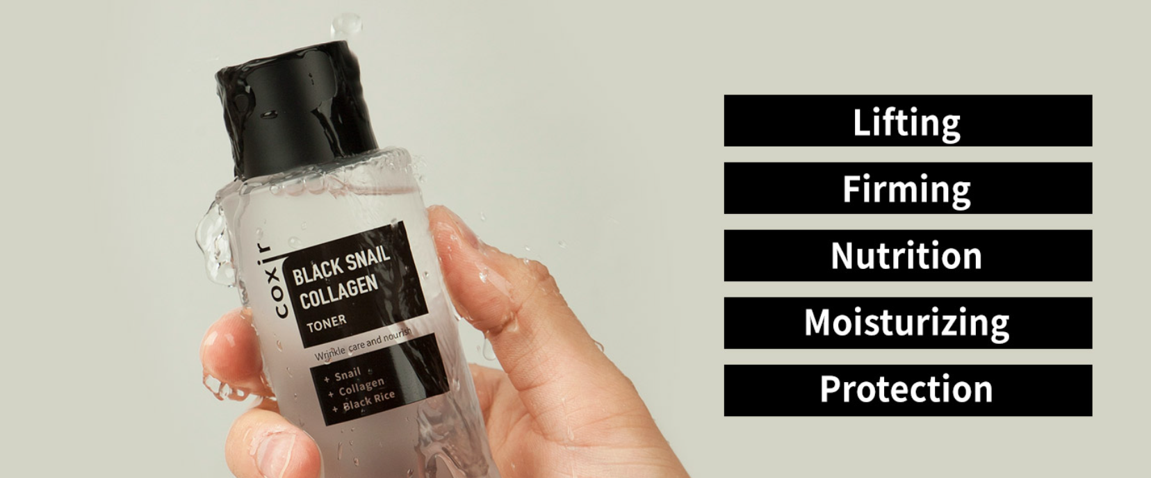 The Black Snail Collagen Essence Toner containing the ingredients of snail and collagen for protecting skin from dryness by maintaining moisture level and providing luminance to skin.