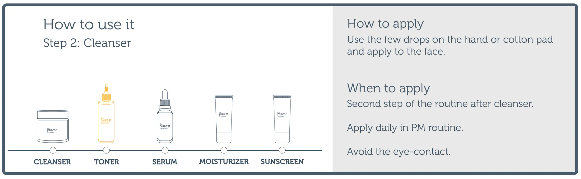 After cleansing, apply to dry skin with help of cotton pad or hands in PM routine. Does not require rinsing after application. Avoid the eye-contact. It is recommended to store in a place free of direct sun exposure.