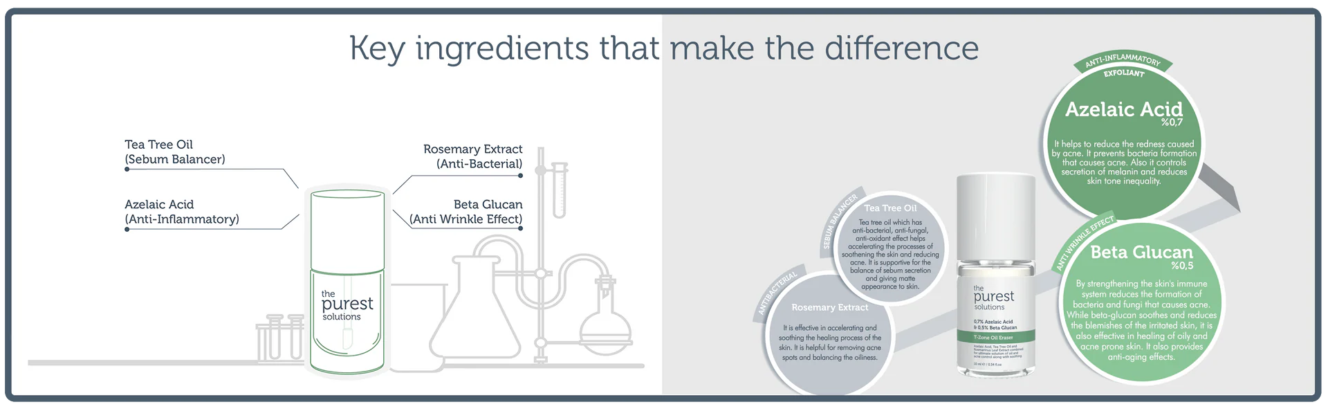 Its oil absorber boosted formula reduces shiny feeling by balancing sebum. Azelaic Acid, Tea Tree Oil and Rosmarinus Leaf Extract combined for ultimate solution of oil and acne control along with soothing.